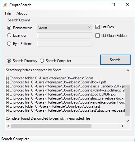 Michael Gillespie has updated CryptoSearch so that it now supports files encrypted by Spora Ransomware.