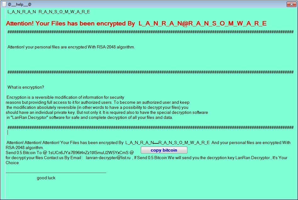 Don't ransomware developers have any pride anymore? This is obviously not apparent with the LanRan ransomware discovered by Karsten Hahn. This ransomware appears to be in-dev as it just sets the background and displays an ugly ransom lock screen. The contact email for this crapsomware is lanran-decrypter@list.ru.