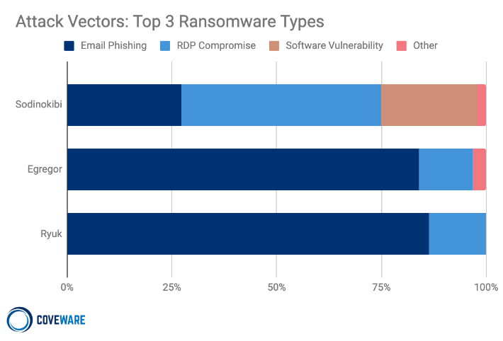 According to Coveware statistics, closed RaaS operations like Sodinokibi, Egregor, and Ryuk dominate the market share, breaching companies mostly via phishing and compromised RDP connections.