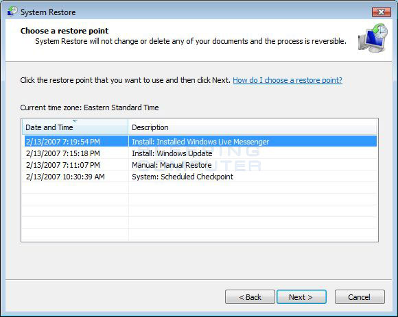 You will now be at the System Restore screen as shown below in Figure 1. From this screen you can specify the restore point that you would like to restore.