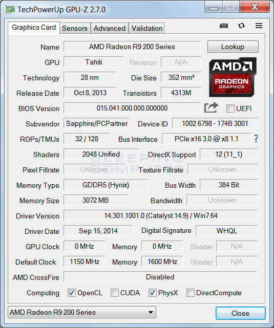 GPU-Z support both AMD and NVIDIA cards and displays information such as graphics card model, the GPU load, the clock speed, its BIOS version, the amount of memory, the amount of shaders, and more.