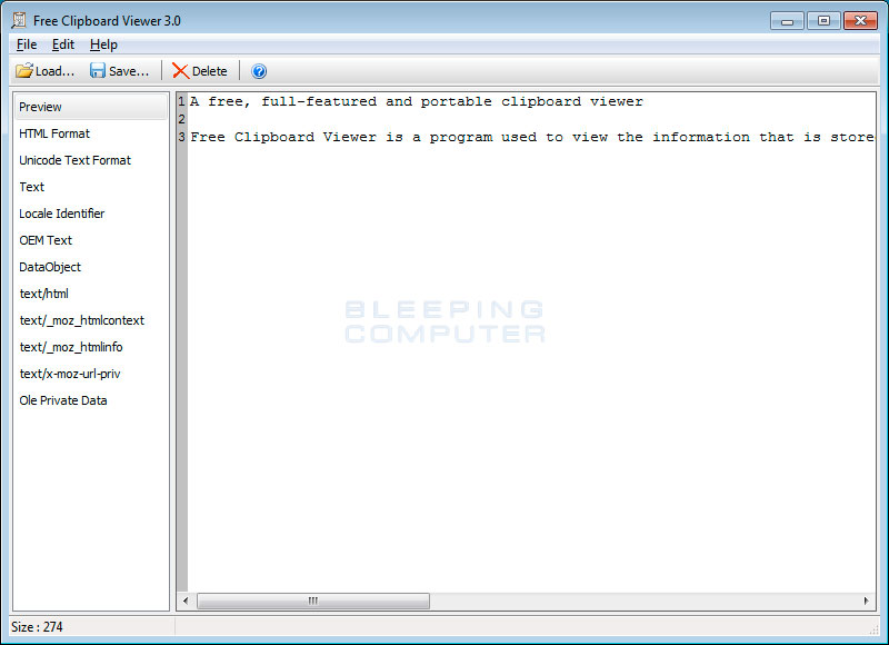 Free Clipboard Viewer is an application that allows you to see the data that is currently copied into the Windows Clipboard. The Clipboard is a utility in Windows that allows you to store information into it that can be then pasted into another application or location. Using the Free Clipboard Viewer you will be able to see exactly what was copied into your clipboard and detailed information about the copied data.