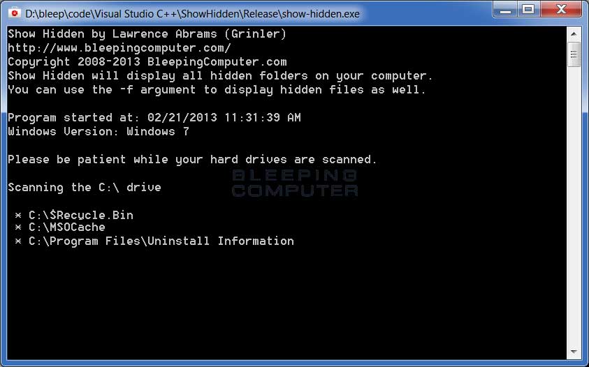 In order to properly run Show Hidden, you will need to run it as an Administrator. This will allow the program to scan all folders and files on your computer. To start the program, just double-click on the downloaded show-hidden.exe file and the program will start scanning your drives. If you wish to list hidden files as well, you need to use the -f command line argument. To use the -f argument, start the program from an elevated command prompt or create a shortcut for it using that argument.