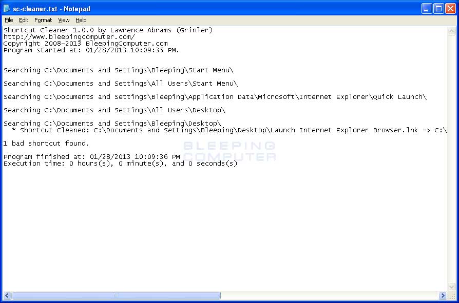 When run, Shortcut Cleaner will scan various locations on your computer for Windows shortcuts. When a shortcut is detected it will check properties for a possible hijacking. If one is detected, it will automatically clean the shortcut so that it no longer opens the offending program or web site. When the Shortcut Cleaner has finished scanning your hard drive it will create a log file on your desktop called sc-cleaner.txt and then display it. This log file will contains a list of all the shortcuts that were detected and cleaned.