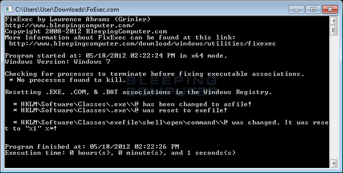To use FixExec to fix your file associations, simply download the 32-bit version of the program or the 64-bit version to a location that you have write access to. A good location to download this file is your Windows desktop. Once the file is downloaded, simply run the program, accept the license, and let it go to work. The program will first terminate any programs that are launched from locations that are known to be used by Malware. It will then repair your .bat, .exe, and .com file extensions so that these types of programs can launch again.