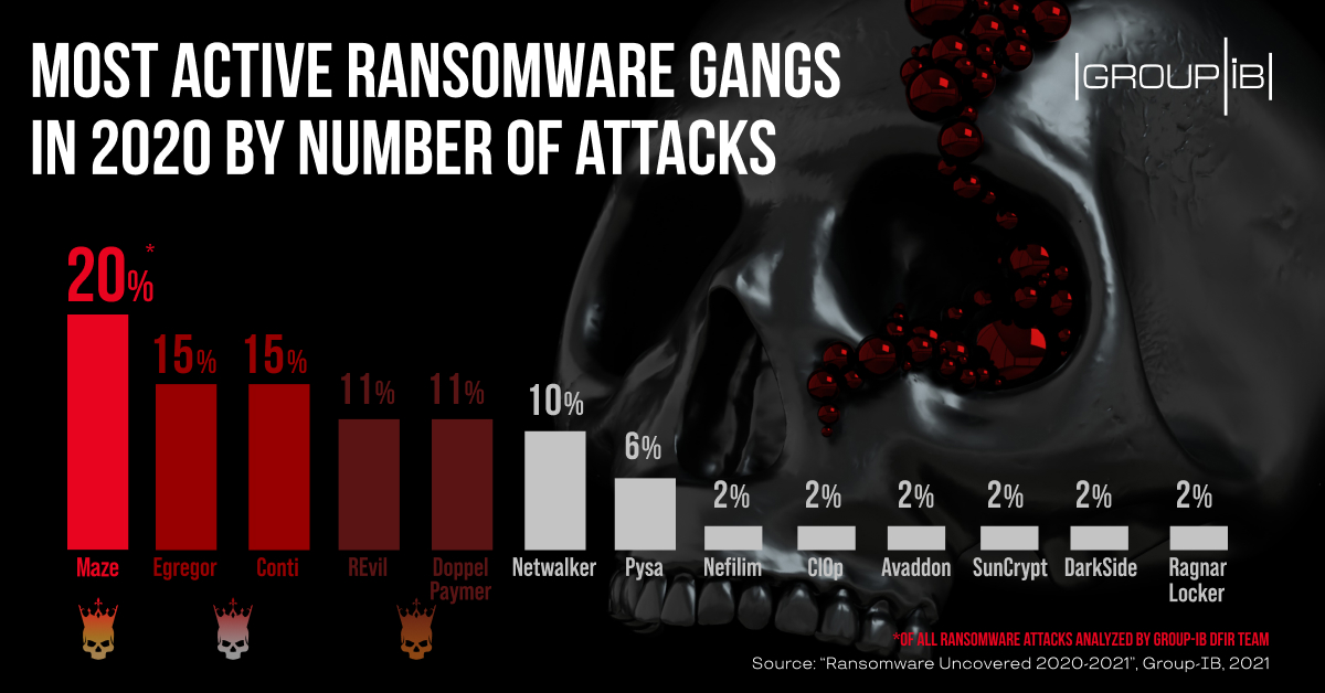 Among the new actors that joined the big-money ransomware game in 2020 are Conti, Egregor, and DarkSide. As per Group-IB’s data, the first two became so prolific that they have a spot in the top five gangs with the largest number of attacks.