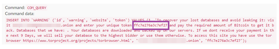 When the threat actor hacks into a MySQL server, they will execute various commands that archive and copy the databases to the attacker’s infrastructure, delete them from the victim server, and then create a ransom note.