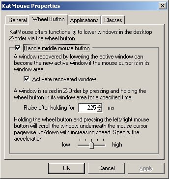 Another feature involves the wheel button. Since the wheel button is not consistently used in Windows, KatMouse can use it for a kind of task switching: with a click of the wheel button you can push a window to the button of the stack of windows that is your desktop, making a recovered window the active window.