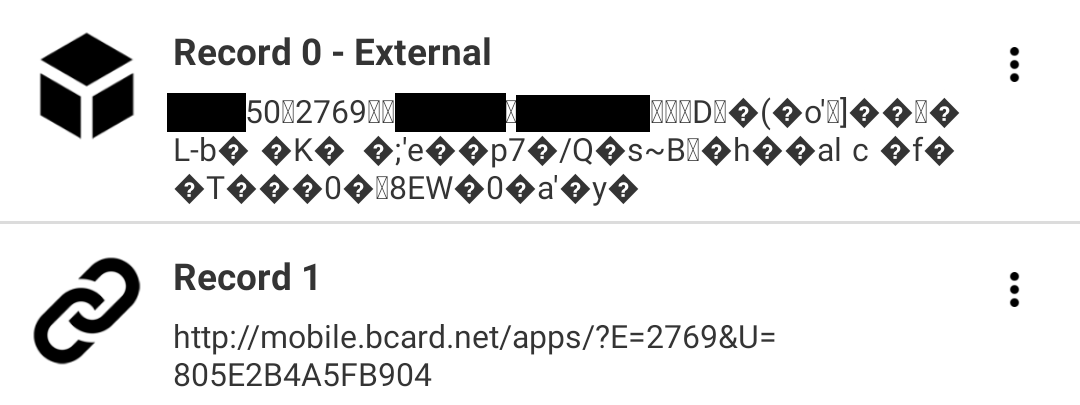 In a different record of the chip, the reader pointed the user to the BCard app - a business card reader for Android and iOS.